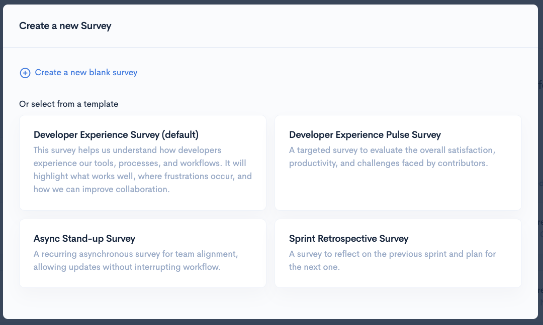 - This will open the Create a new Survey modal. Here, you can choose between a new blank survey to create one based on your needs, and our templates (Developer Experience Pulse; Async Stand-up; Sprint Retrospective, and more).