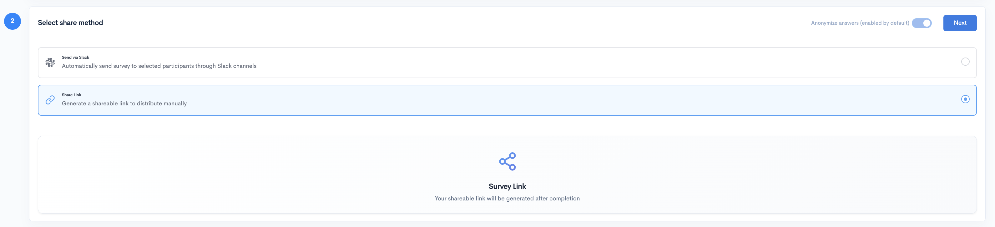 Before creating a survey, ensure the Slack bot integration has been configured. For more details on how to do the integration, click here.