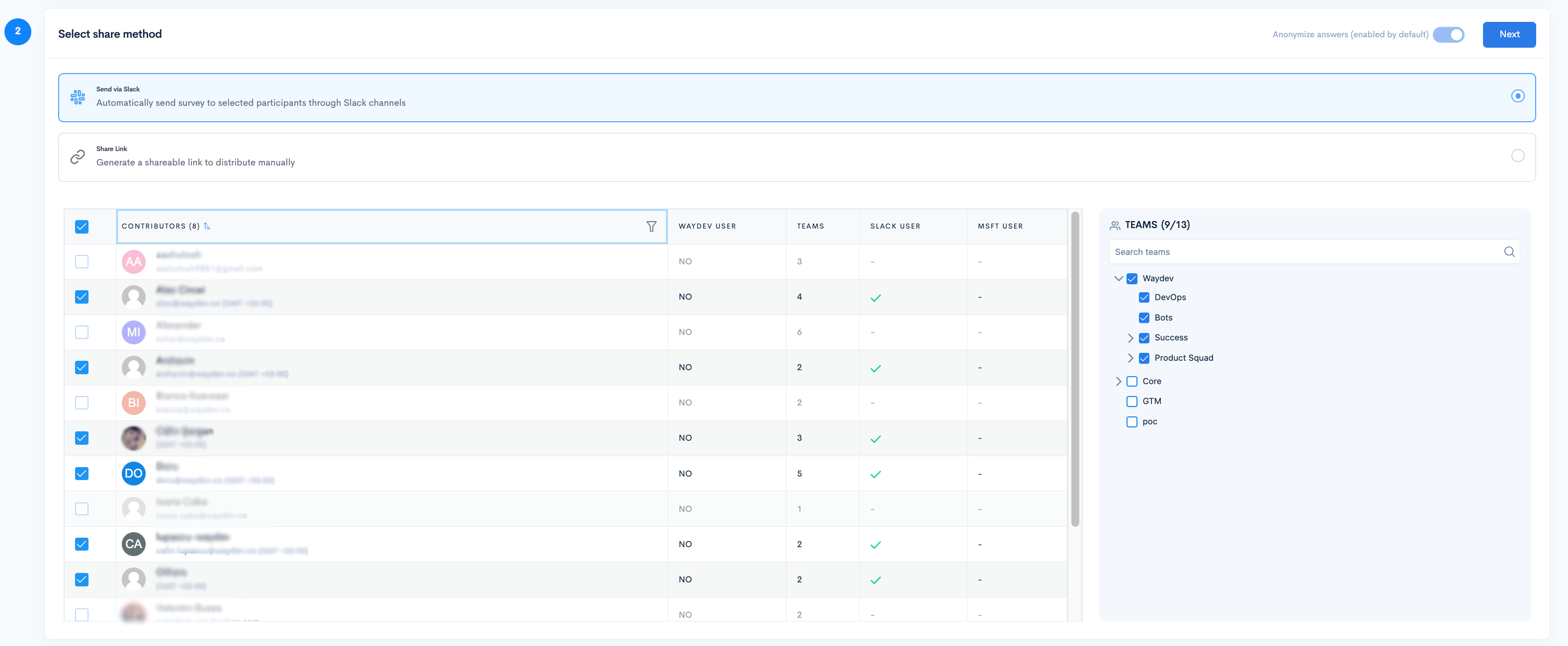 - From the list of contributors, select the ones you want surveyed (or all of them) and click Next.