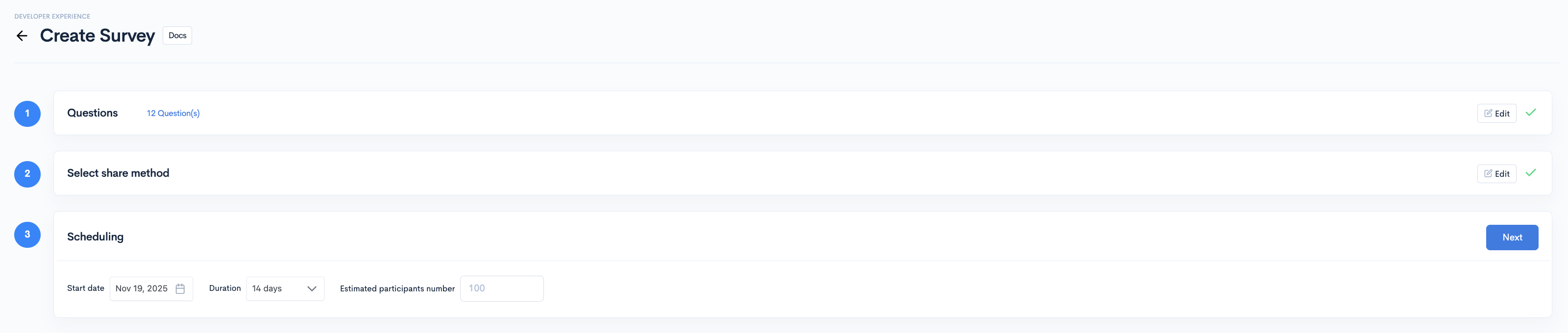 If the survey is sent as a link the scheduling steps will have fewer options. You'll be able to edit: