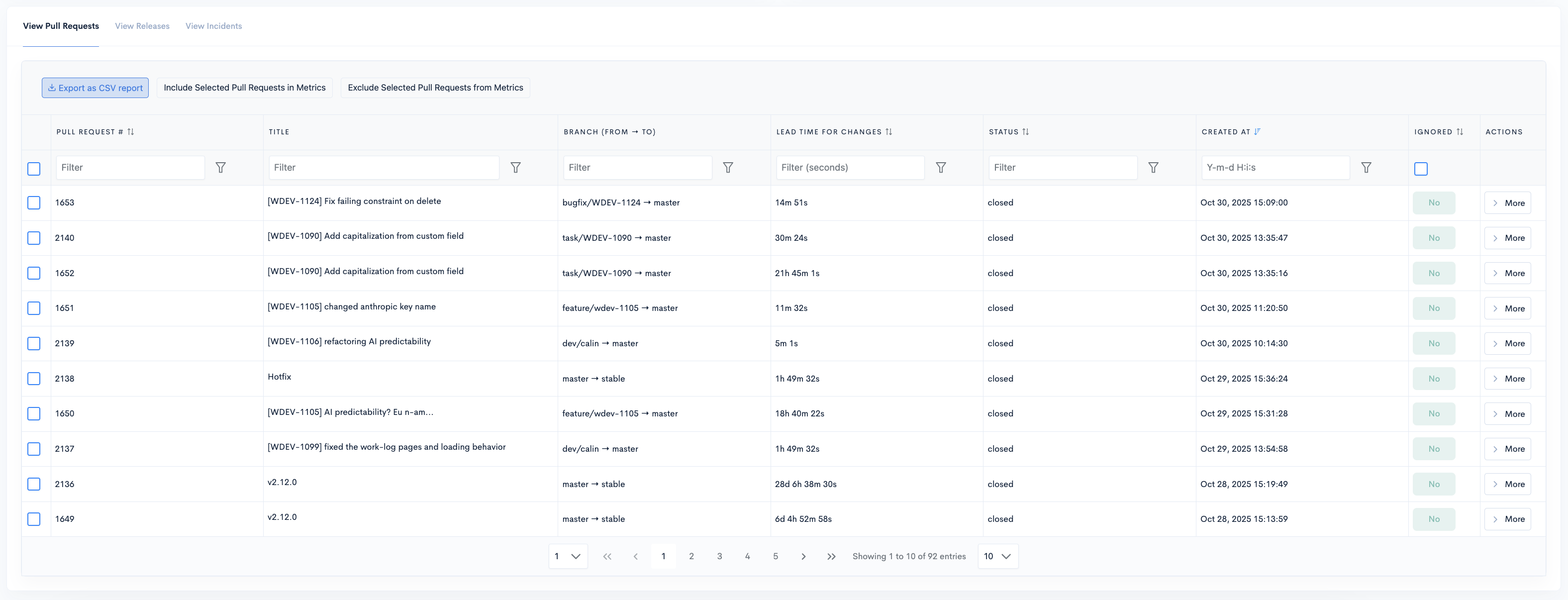 To see a Pull Request breakdown of all the Pull Requests analyzed in the selected timeframe, scroll down and click View Pull Requests. To zoom into a particular Pull Request, click the "More" button corresponding to that Pull Request.