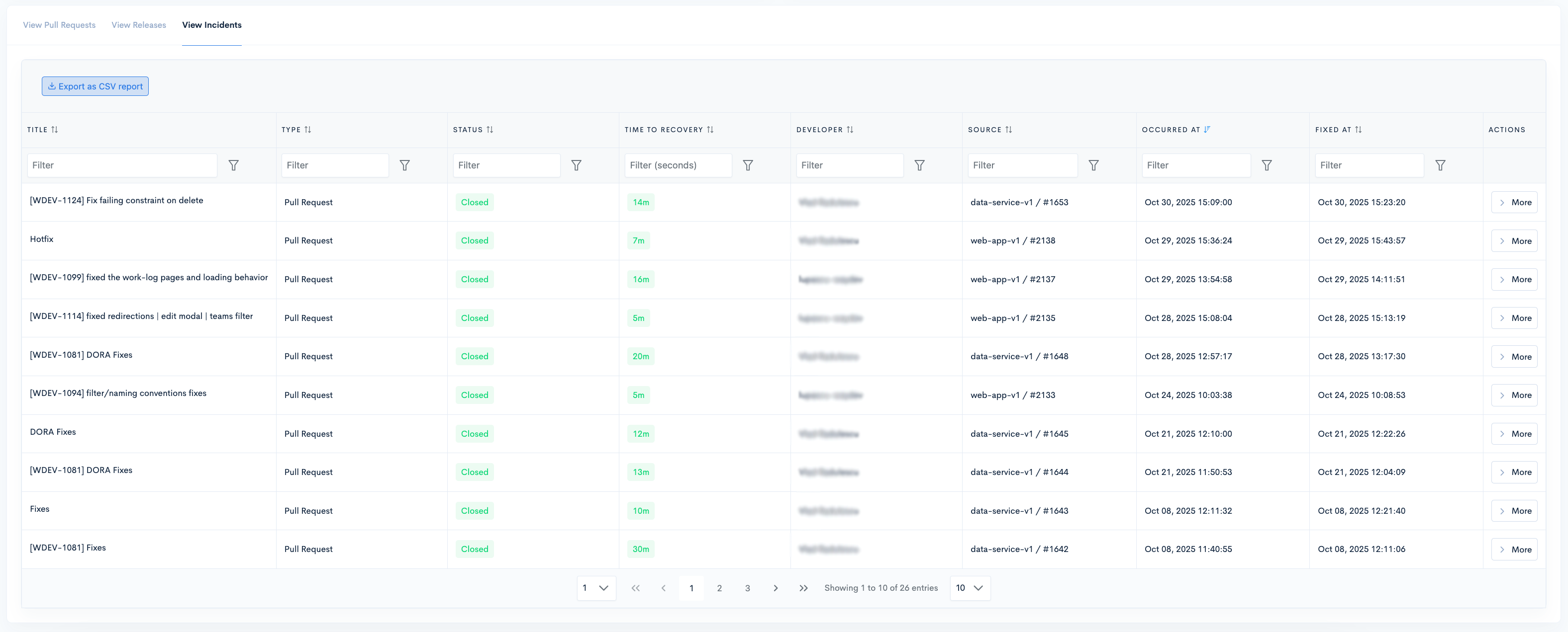 To view all failed deployments for the selected filters, scroll down and click View Incidents. You can view the type, status, time to recovery, developer, source, occurred date, fixed date.