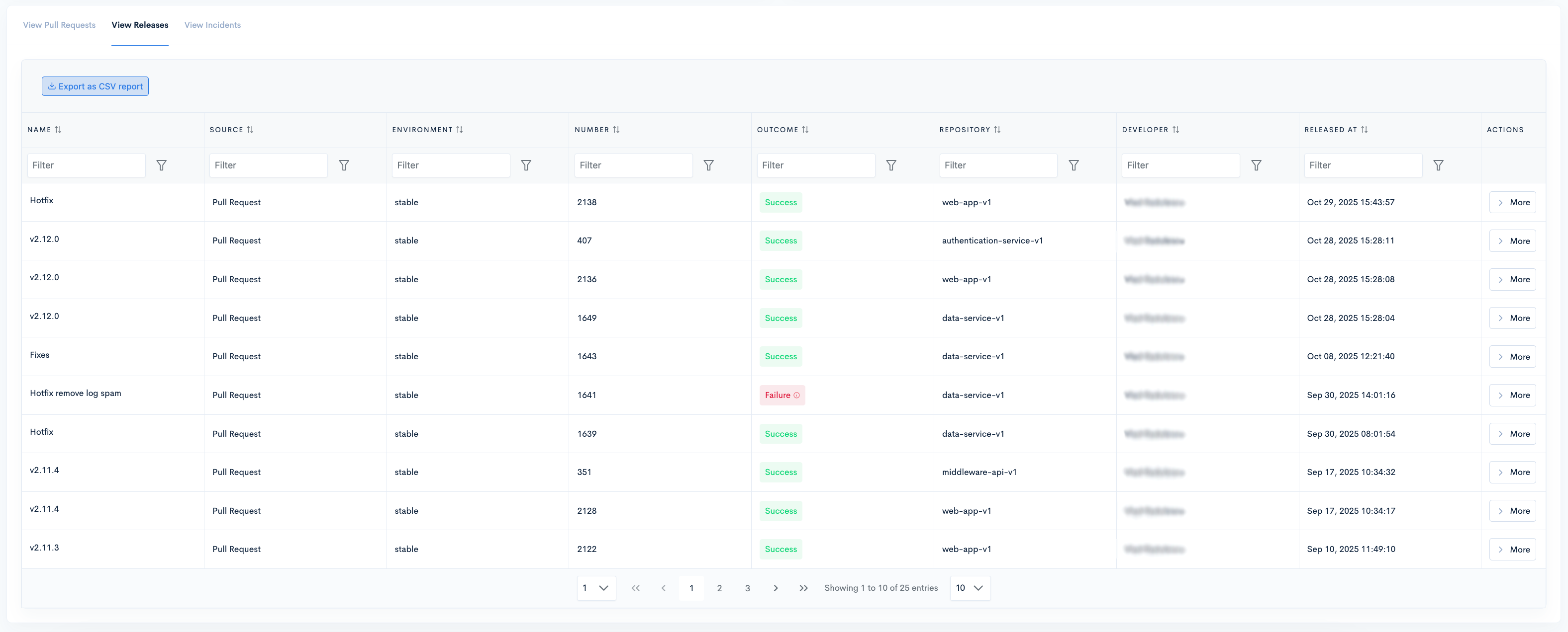 You will see a breakdown of builds/deploys that occurred in the selected time period across the selected applications, including the source, environment, the number, outcome, repository, developer, release date.