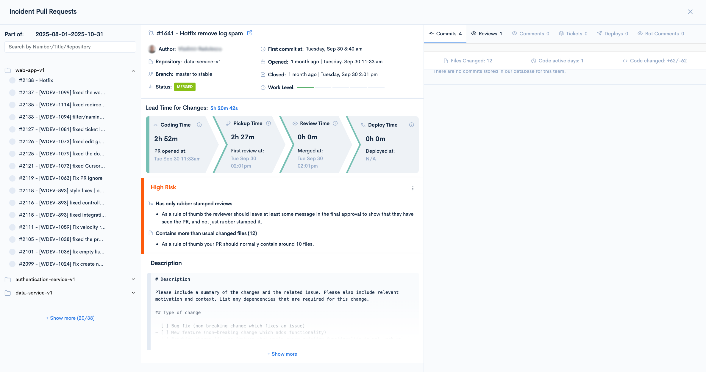 Once clicked, a modal will appear containing more information, such as the date of the first commit, when the Pull Request was created, when the Pull Request was reviewed and merged, the total number of files and lines of code affected, and the Lead Time for Changes for the Pull Request.