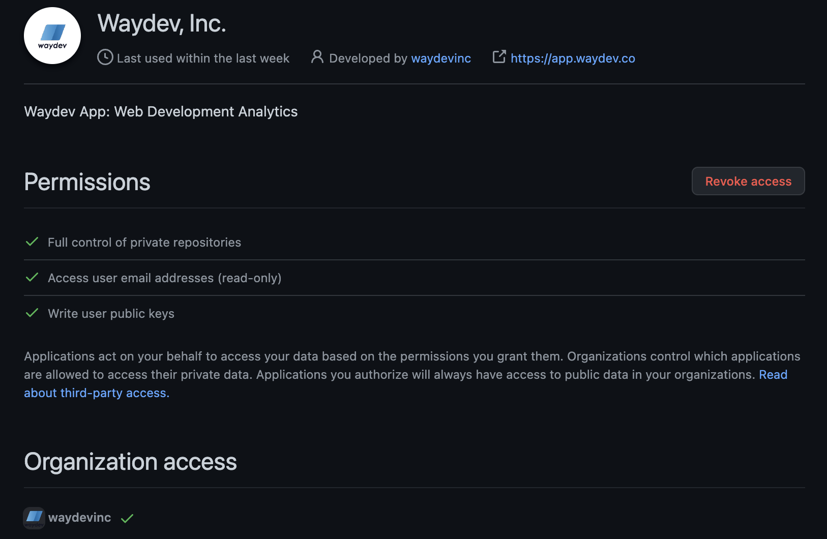 Then click on Waydev, Inc. and confirm that all required permissions/scopes are enabled. It should look something like this: