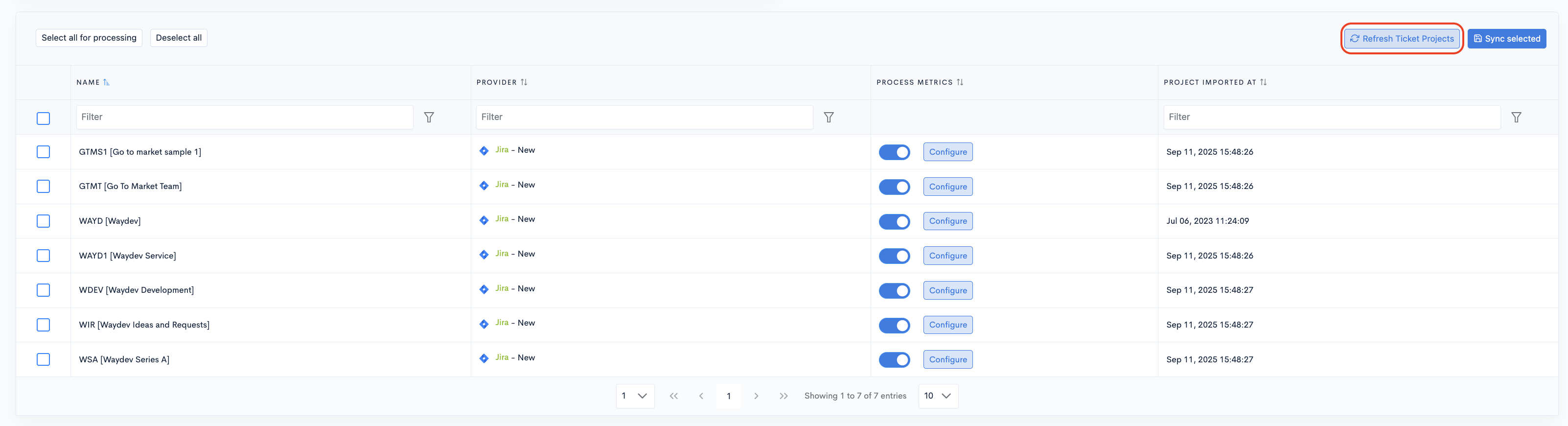 If the ticket project does not appear after some time, it indicates that Waydev does not have access to it. In this case, please contact us for assistance.