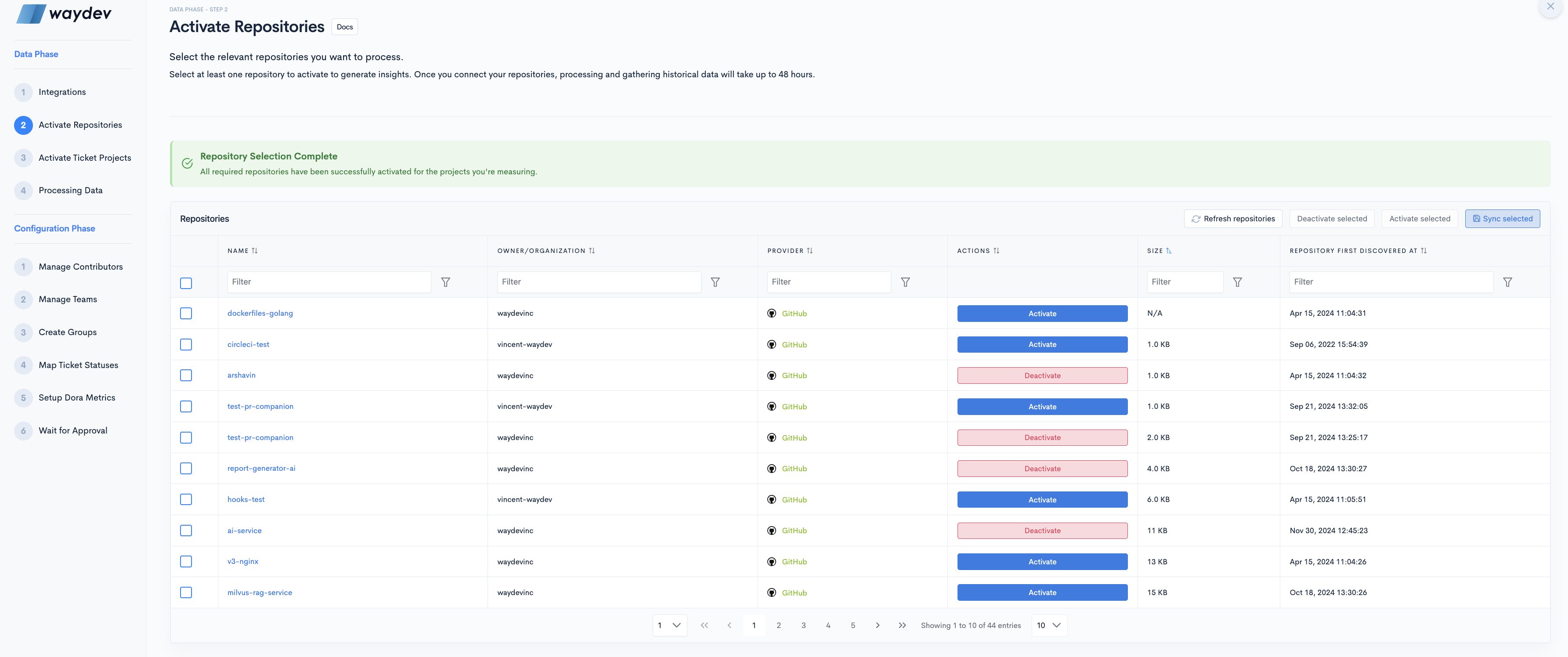 The Repositories page displays a list of all repositories aggregated from your Version Control System. Here, you can select which repositories to include in your metrics.