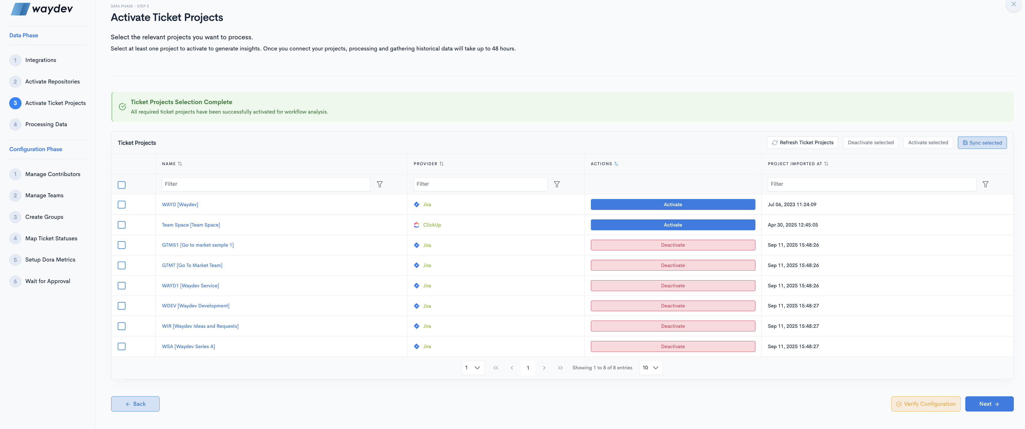 - Upon selecting "Ticket Projects," you will be presented with a list of all ticket projects that are linked to your Waydev account.
