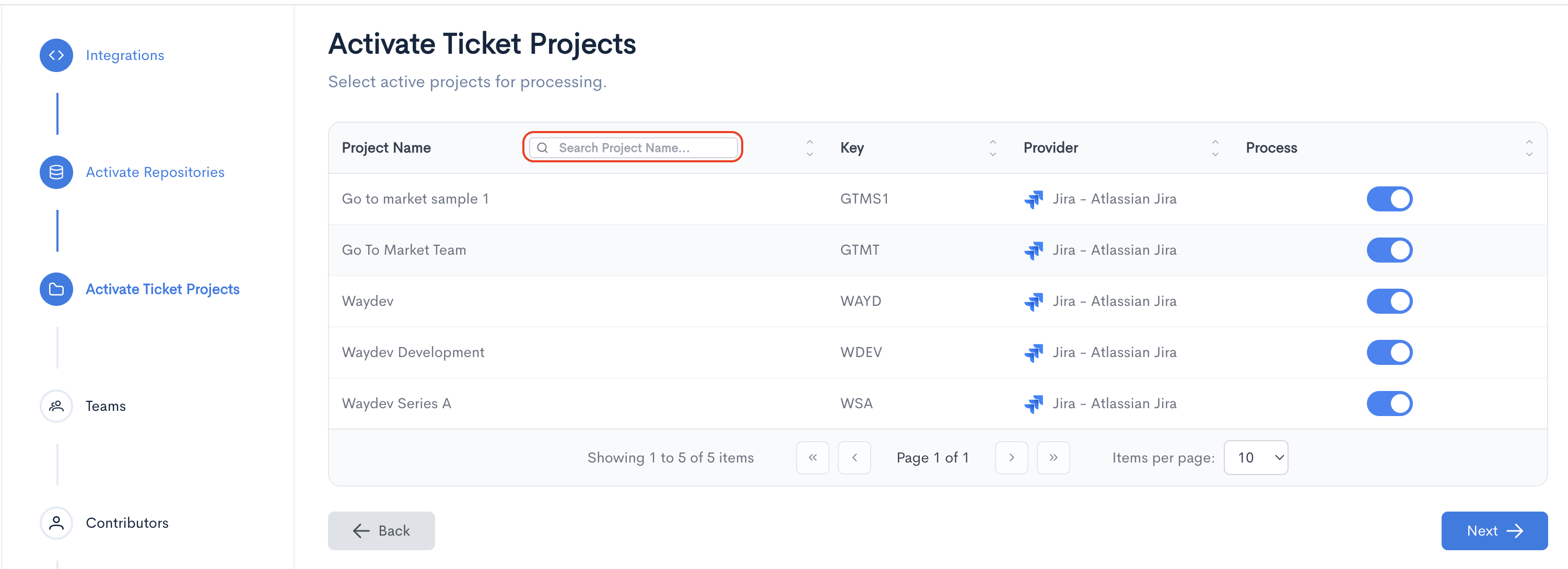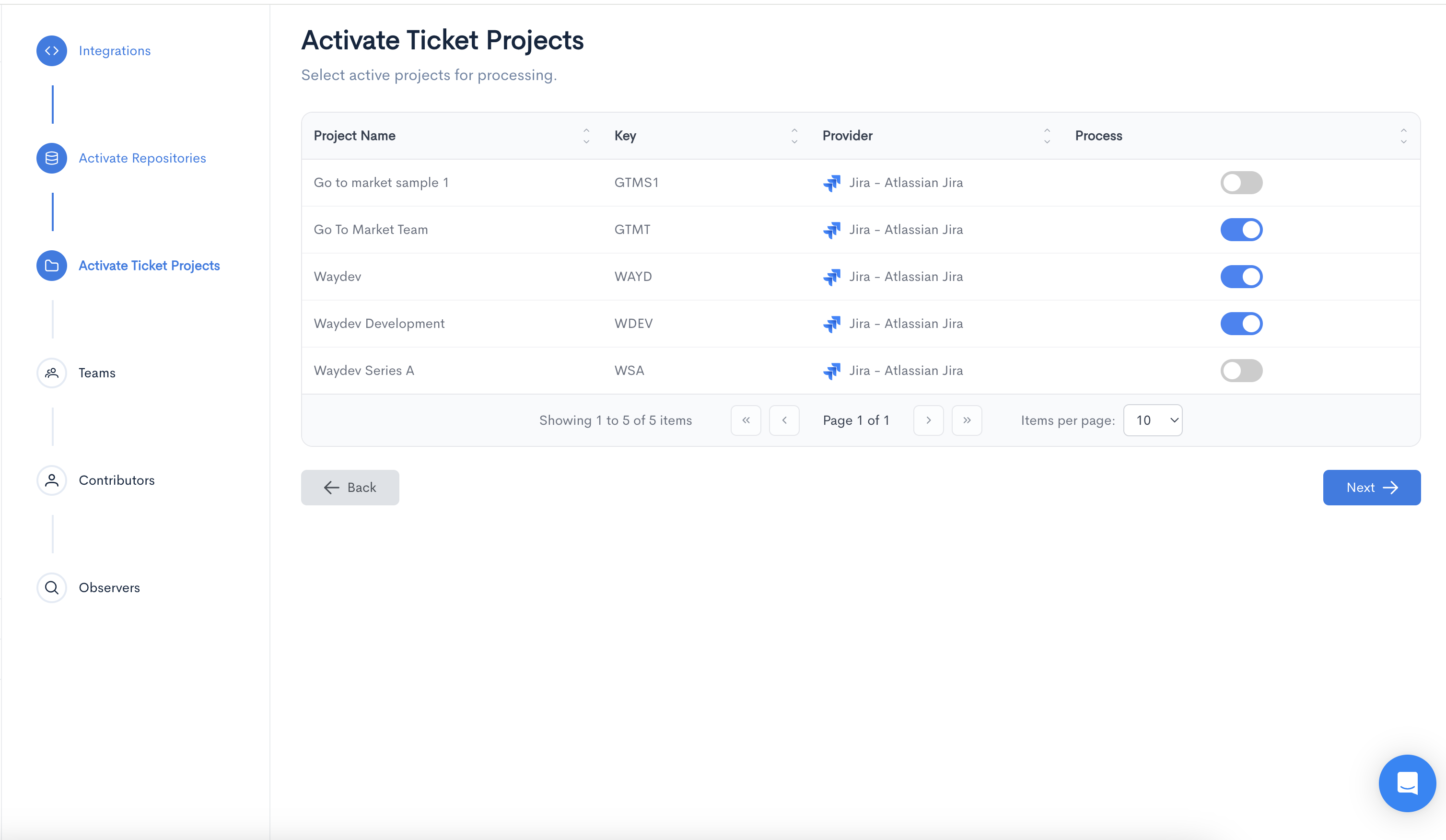 The Waydev AI ticket project activation interface allows you to configure and enable AI-powered analysis for your development projects. Simply select the ticket projects you want and toggle them on.