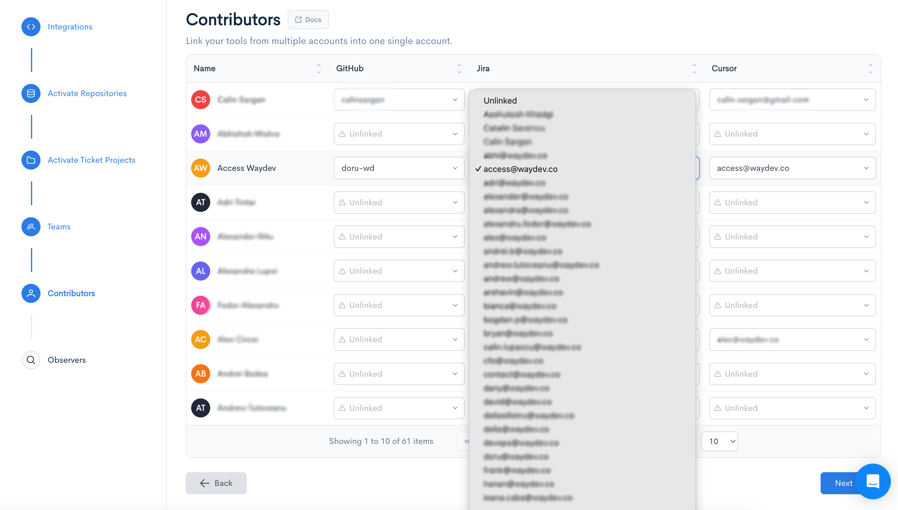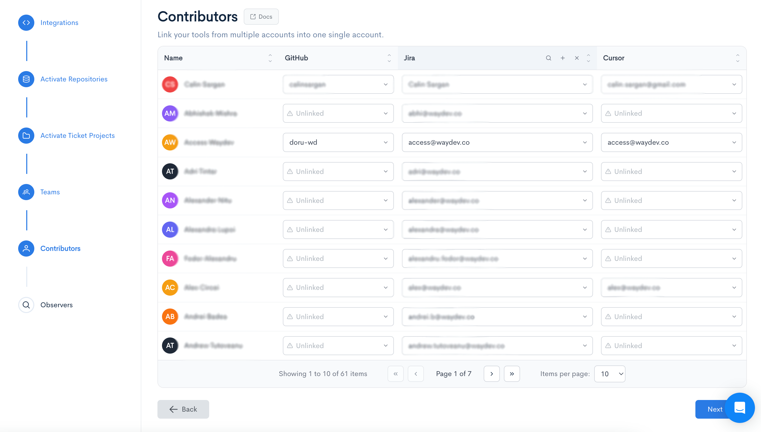 In the Contributors step you need to link the profiles from the tools under one Waydev profile.