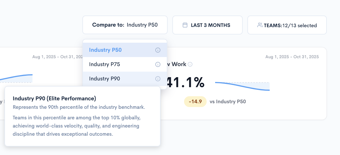 The filters allow changing the view between Industry P50, P75 and P90 to compare the internal averages to industry averages for benchmarking.