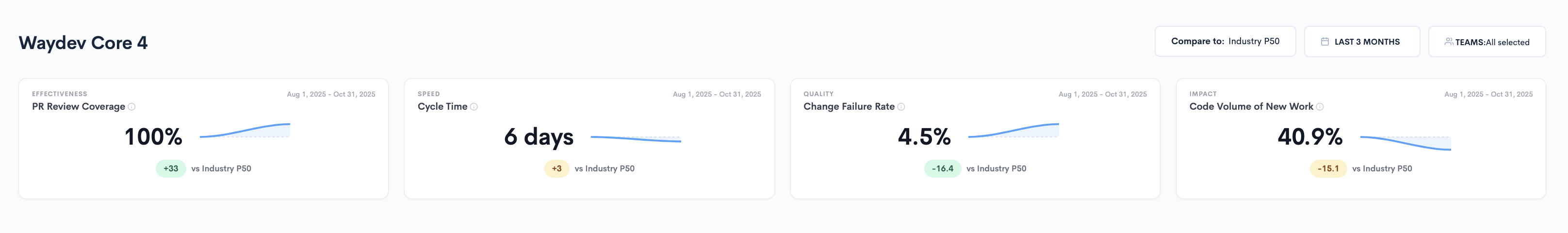 By combining system data with contextual analysis, Waydev Core 4 provides actionable insights that balance speed, stability, and innovation. It empowers leaders to make informed decisions and enables teams to continuously improve engineering effectiveness.